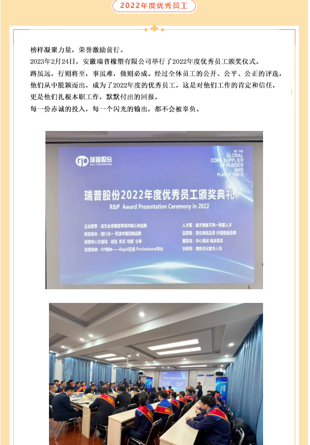 董事長對各部門、子公司負責人的2022年度總結及2023年度工作規劃進行分析,對大家疫情期間的工作予以肯定,并對其薄弱與不足之處提出改進意見。2023年公司將圍繞開拓新市場、項目管理制度、事業部智能化制造、員工工作能力、公司管理制度等方面進行提升。努力為員工提供更好的福利待遇,為客戶提供更優質的服務,為實現瑞普成為全球橡塑零部件核心供應商的企業愿景而不懈努力!
